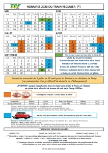 -pour les trains de balade pour les individuels dont les horaires figurent ci-dessous : aucun changement sur la prestation Draisine + visite des musées (en bleu sur la fiche horaire). Pour la formule de voyage en autorail toujours pour les individuels (couleur orange sur la fiche horaire), voyage aller/retour Toucy-Ville/Dracy-sur-Ouanne, sur place, une heure de pause permettant la visite de sites importants de la commune de Dracy-sur-Ouanne. Des négociations sont en cours pour la visite du pressoir, du verger pédagogique et conservatoire des écoles, de l’église, du parc du château et du musée de la vannerie. Vous serez informés des activités sur le site Internet, en gare et dans le train.
